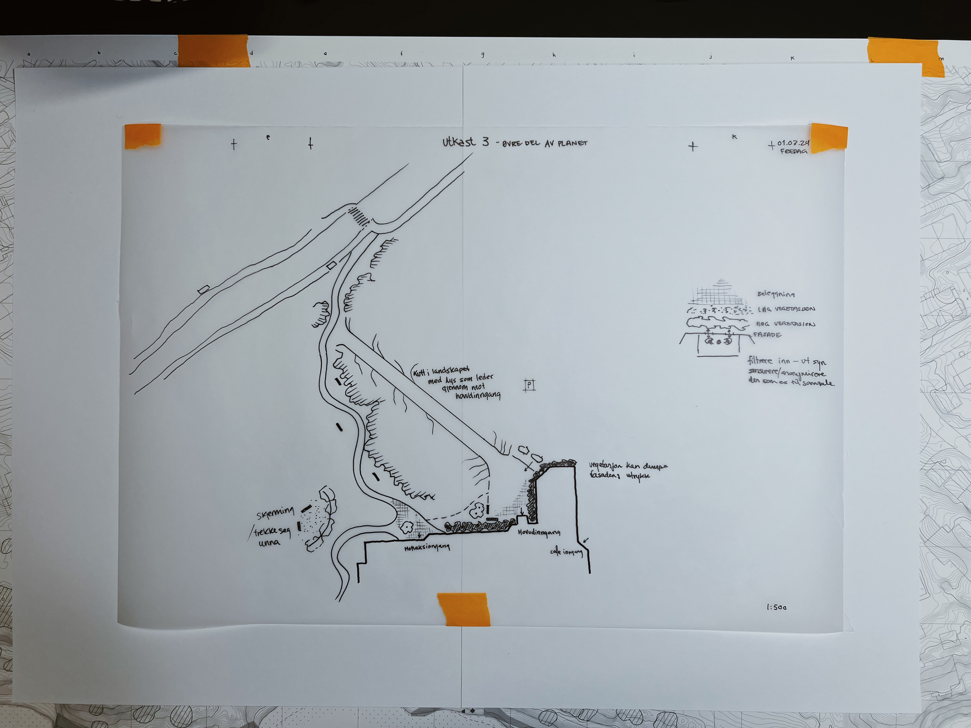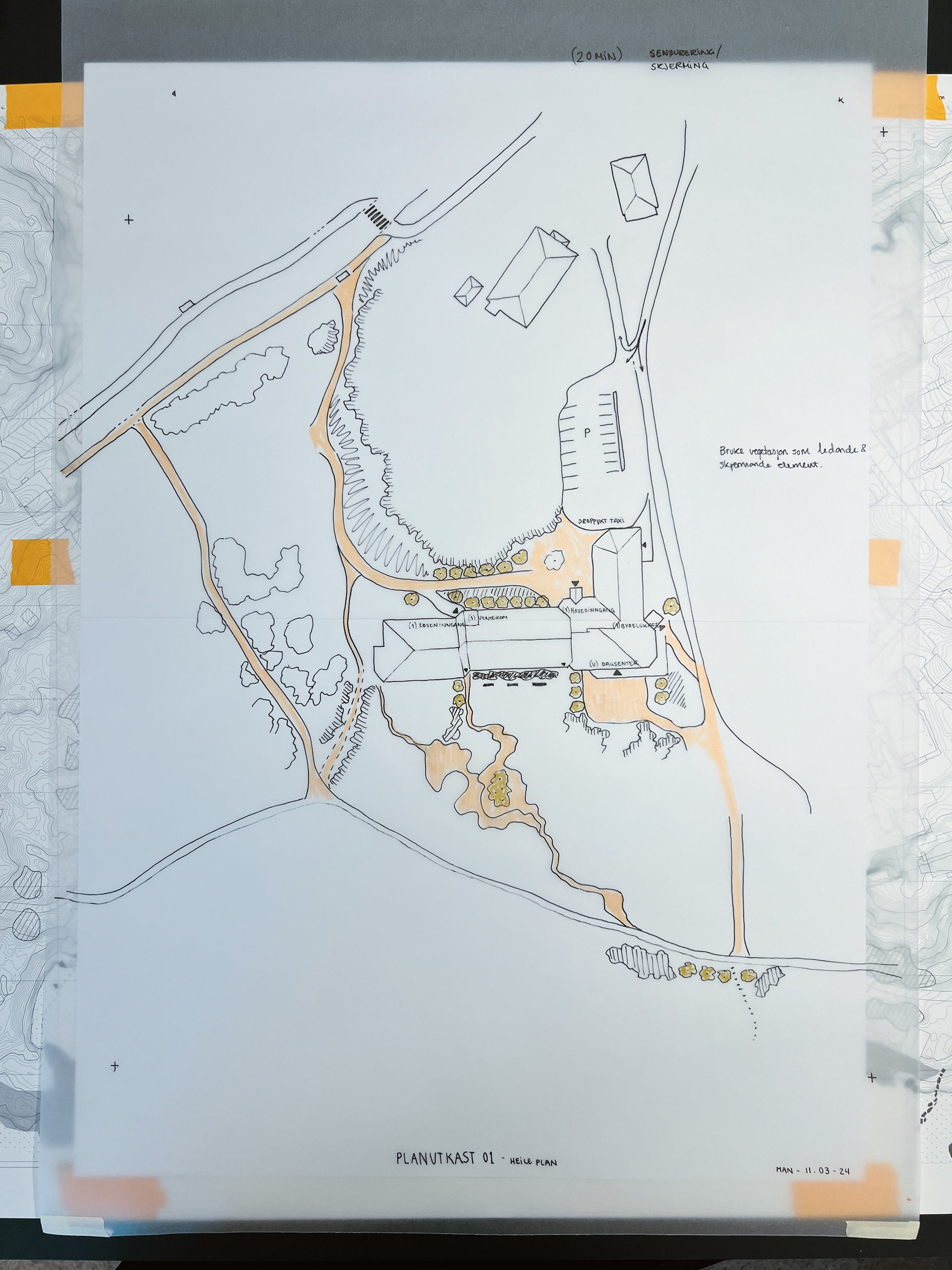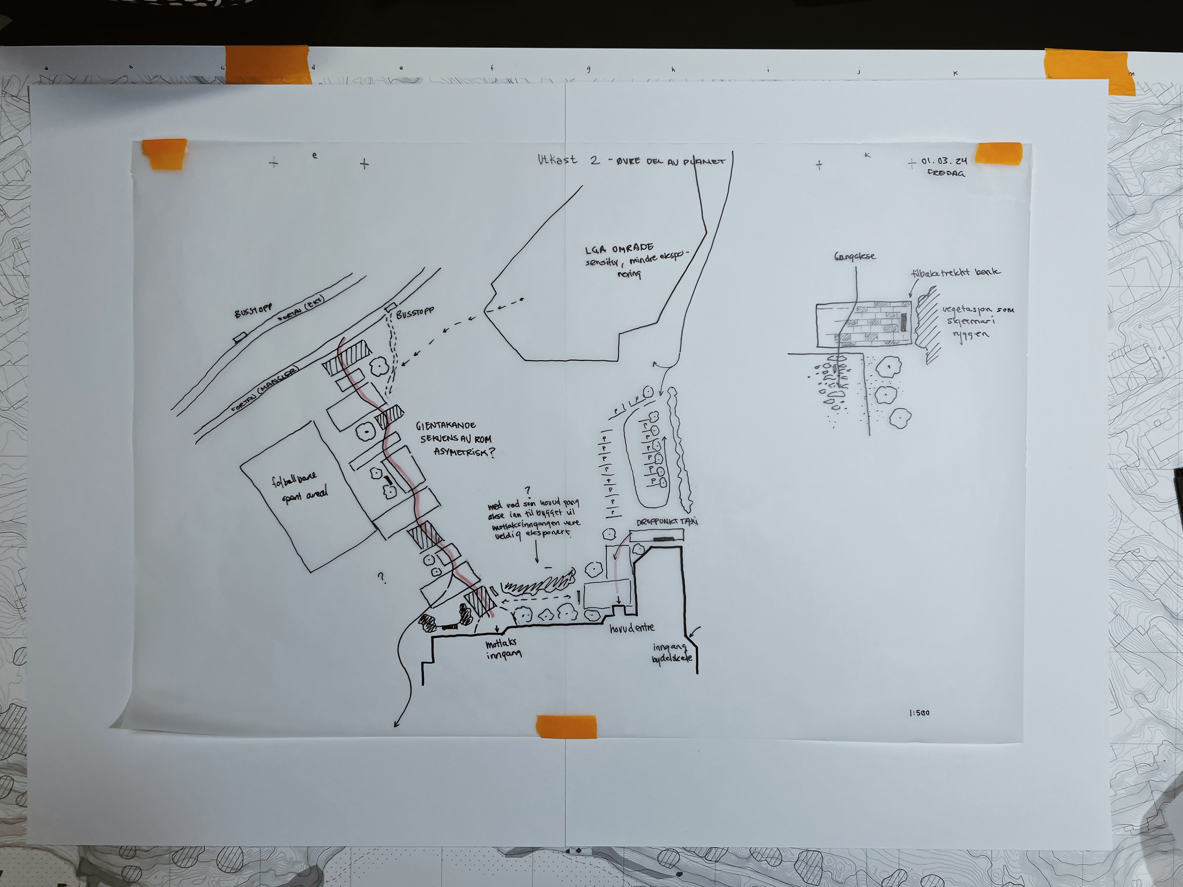 Områdene som vart viktige for dei designerte brukarane var kva man møter ved ankomst og kva man møter når man forlèt bygget. Ved inngangspartiet til behandlingssenteret la eg vekt på å skape ein entre med positive distraksjonar kor man kunne blande seg inn i omgjevnadane og bruke vegetasjon og natur til å skjerme brukaren. Ved utgangen på baksida av bygget la eg vekt på å danne ulike soner til ulik bruk. Dette er for å gi brukaren eit val om korleis den ønsker å interagere med omgjevnadane. Naturen og vegetasjonen i denne del av planen var viktig for å skape rom samt spele på kvalitetane av lyset, materialiteten, atmosfæra, inn- og utsikt samt skape nok rom til å vere aleine eller saman med andre.