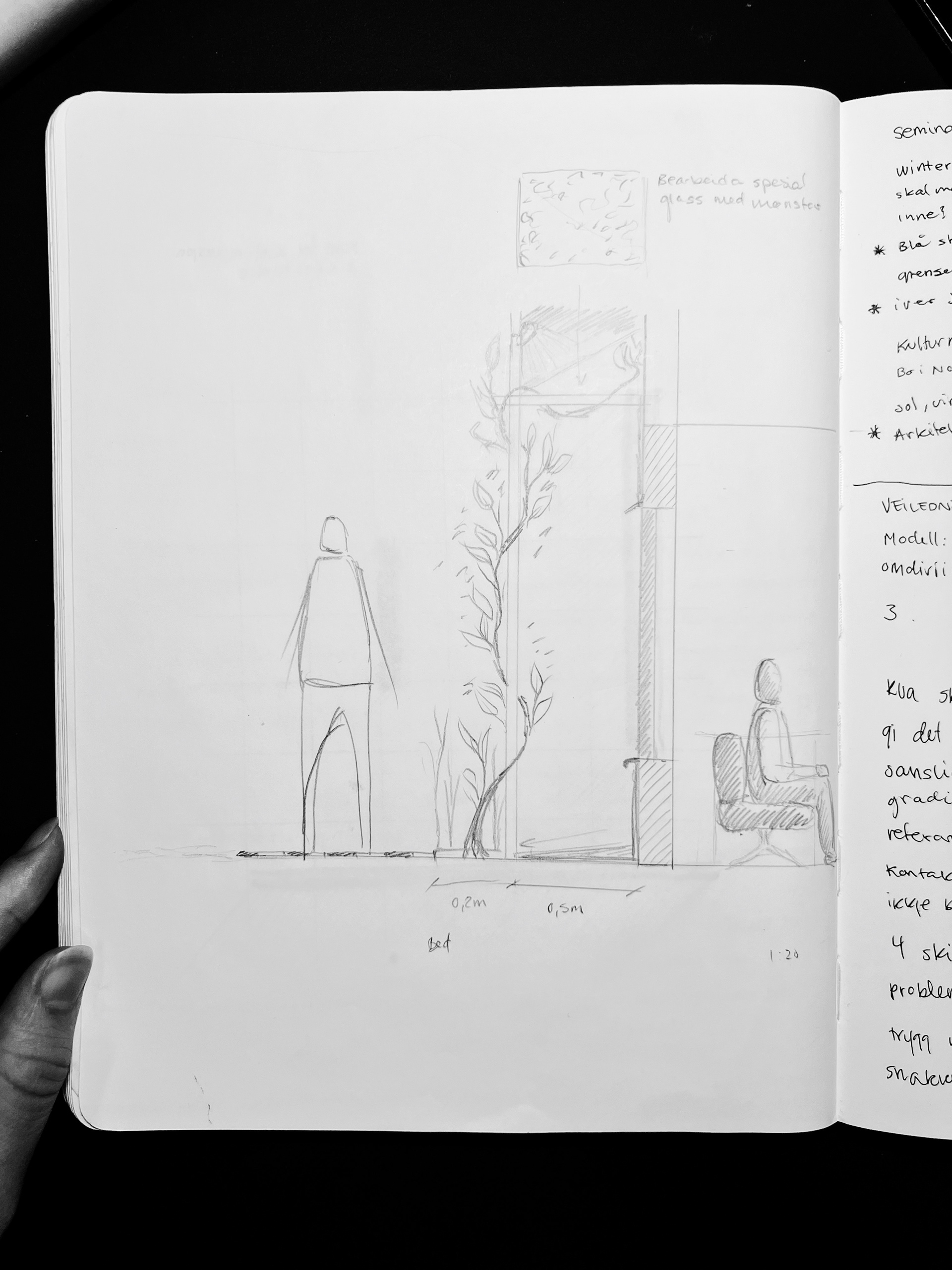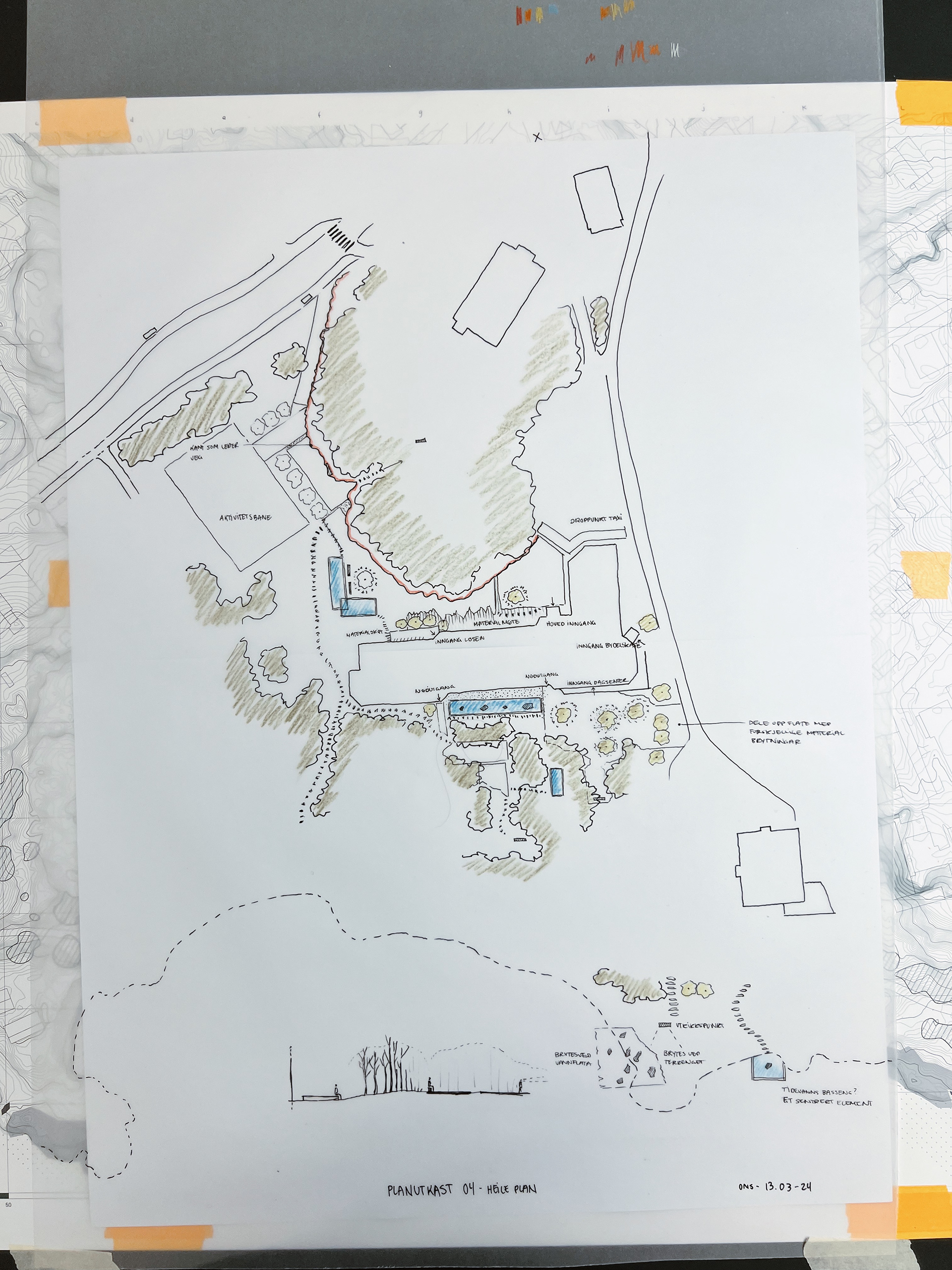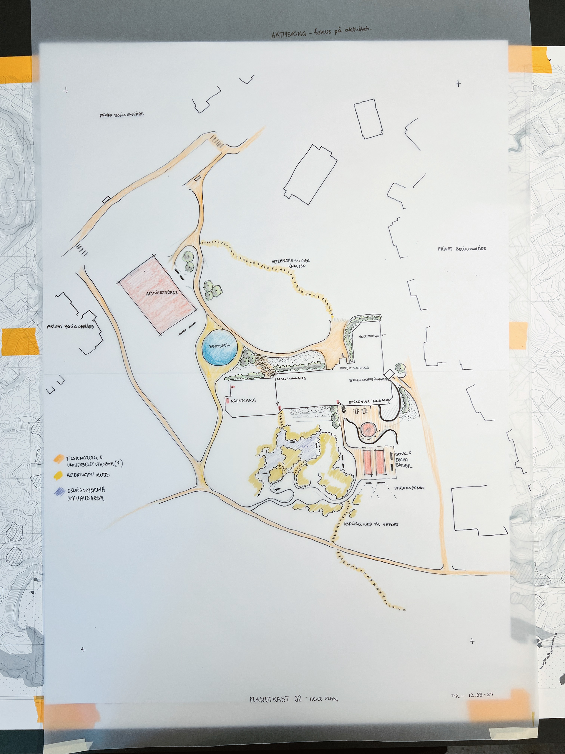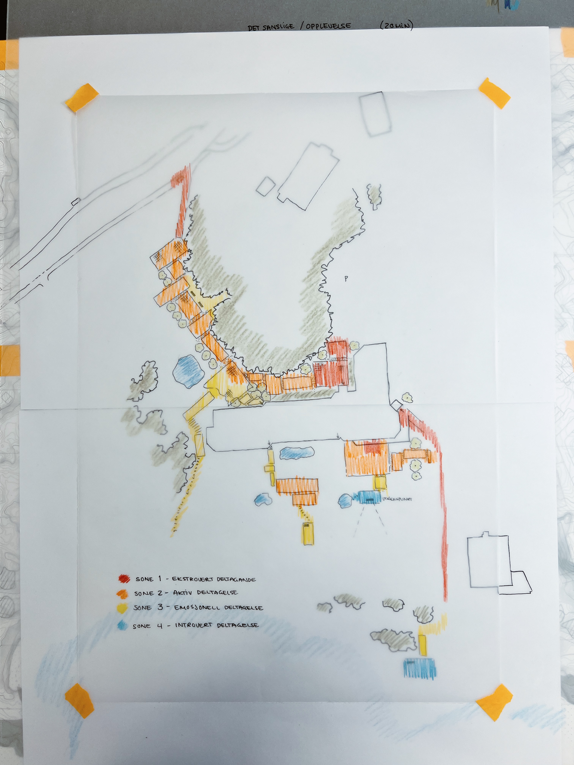 For å kunne ta utgangspunkt i dei eksisterande kvalitetane og bygge vidare på dei i designet, var det viktig å ta tak i kva dei kan gjere for bruken og brukarane av området. Eksisterande situasjon har mange gode sider som ikkje får nå sitt fulle potensiale og ved hjelp av design med fokus på sansane våre og det å skape positive distraksjonar ser eg til behov for oppgradering og behovet dei individuelle brukarane potensielt har.
